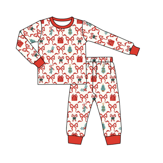 (Custom Design MOQ 20) Adult Candy Cane Bows Holly Print Woman Christmas Bamboo Pajamas Clothes Set