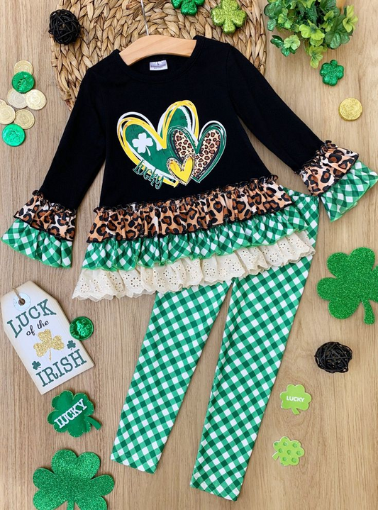 (Custom Design MOQ 5) Luck Heart Ruffles Top Green Plaid Legging Pants St. Patrick's Girls Clothes set