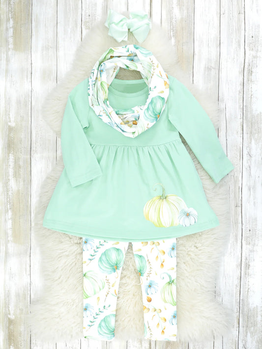 (Custom Design MOQ 5) Aqua pumpkin tunic top legging pants girls 3 pieces fall clothes set