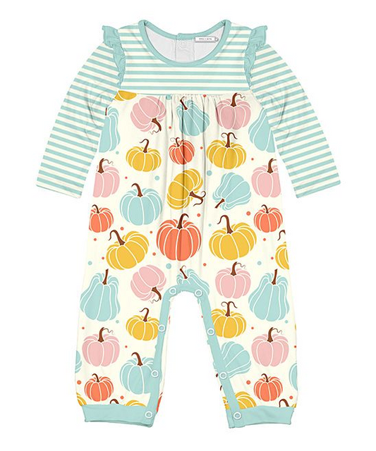 (Custom Design MOQ 5) Aqua pumpkin print baby girls fall romper