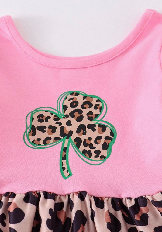 (Custom Design MOQ 5) Pink Leopard Clover Girls Knee Length St. Patrick's Dress