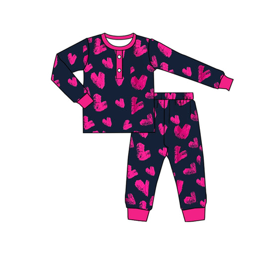 (Custom Design MOQ 5) Pink Heart Print Navy Girls Valentine's Pajamas Clothes Set