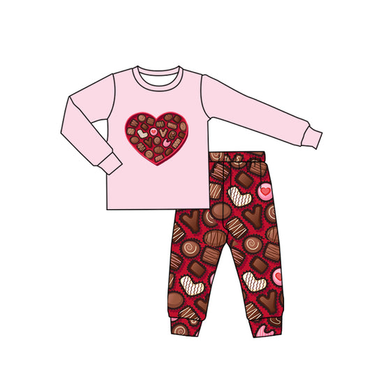 (Custom Design MOQ 5) Pink Heart Chocolate Print Girls Valentine's Pajamas Clothes Set