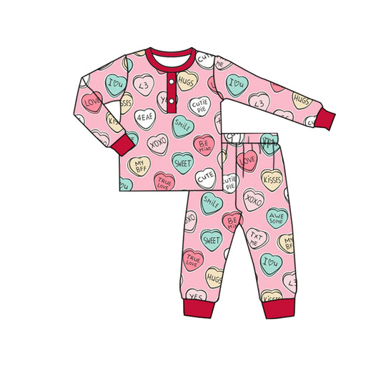 (Custom Design MOQ 5) XOXO Heart Print Pink Girls Valentine's Pajamas Clothes Set