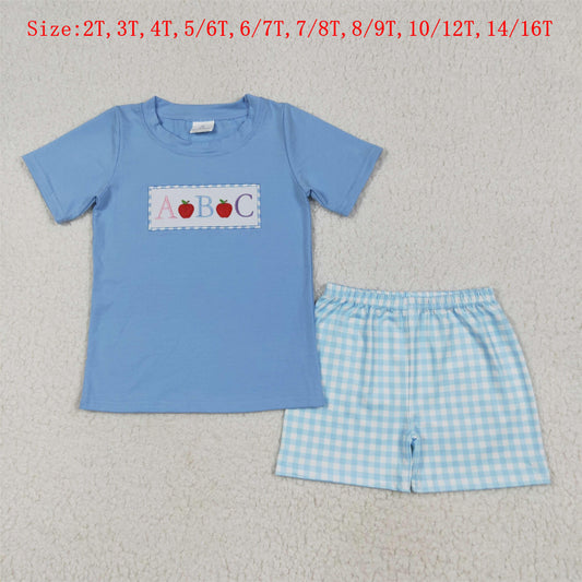 BSSO1331 ABC Apple Embroidery Blue Top Plaid Shorts Boys Back to School Clothes Set