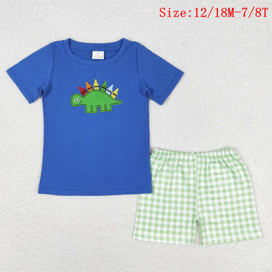 BSSO0805 Dino Pen Embroidery Blue Top Plaid Shorts Boys Back to School Clothes Set