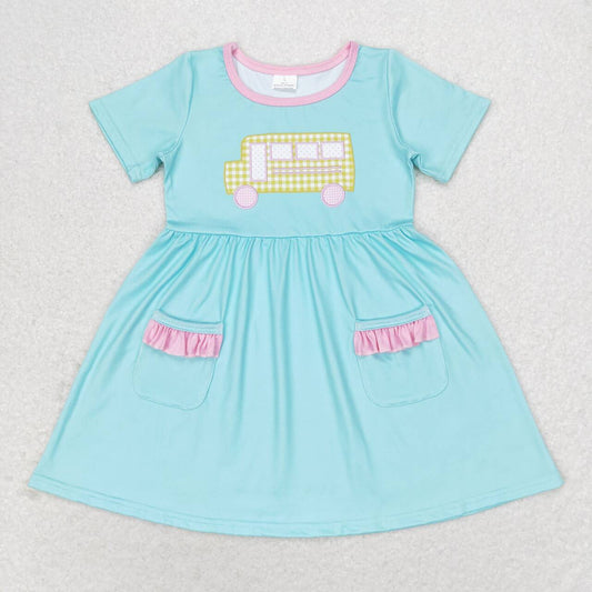 GSD1341 School Bus Print Girls Knee Length Back to School Pockets Dress