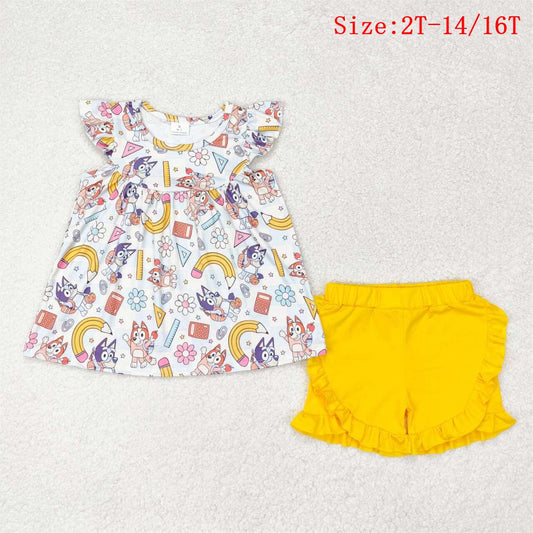 GSSO1246 Cartoon Dog Flowers Rule Pen Top Yellow Shorts Girls Back to School Clothes Set