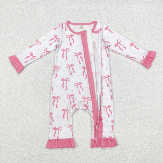 LR1584 Pink Bows Print Baby Girls Fall Bamboo Sleeper Zipper Romper