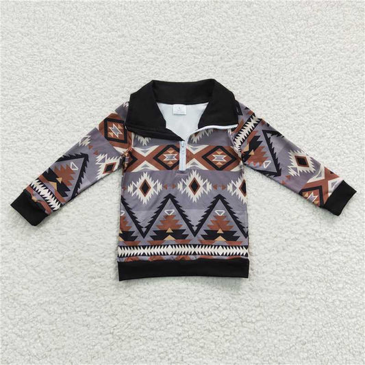 4 Colors Boys Long Sleeve Aztec Print Western Zipper Pullover Top