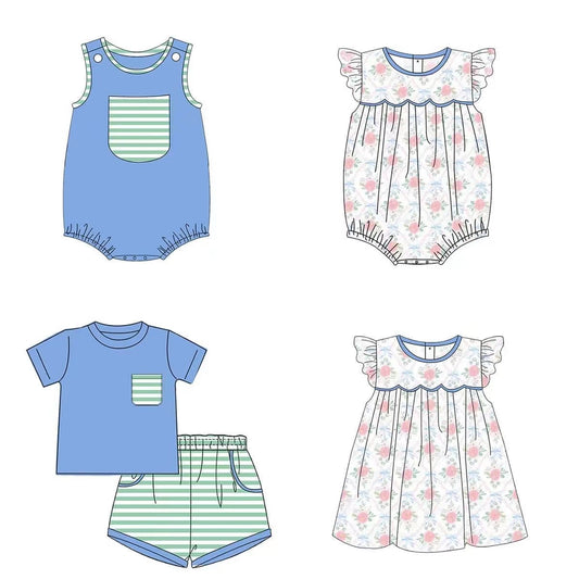 BSSO0417 Peach Embroidery Blue Top Orange Stripes Shorts Boys Summer Clothes Set