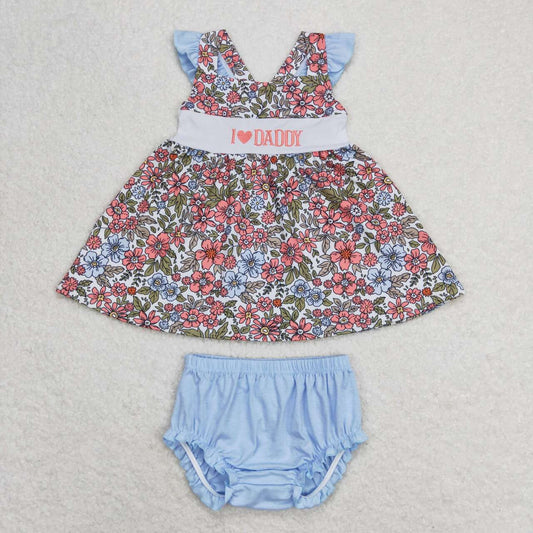 GBO0294 I LOVE DADDY Embroidery Flowers Top Blue Shorts Baby Girls Summer Bummie Set