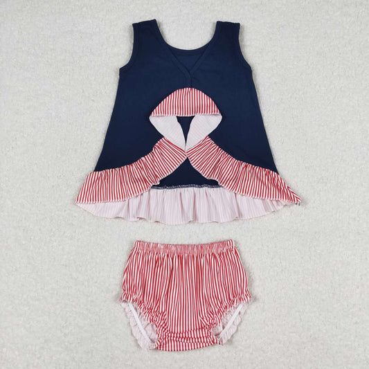 GBO0209 Baseball Embroidery Navy Top Red Stripes Shorts Baby Girls Bummie Set