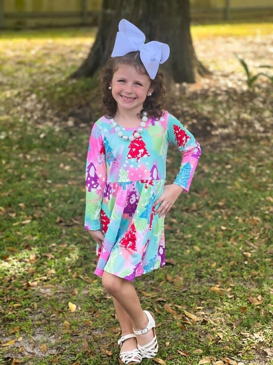 GLD0241 Tie-dye Christmas tree girls knee length dress