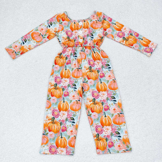 LR1060 Pumpkin Flowers Print Pockets Girls Fall Jumpsuits