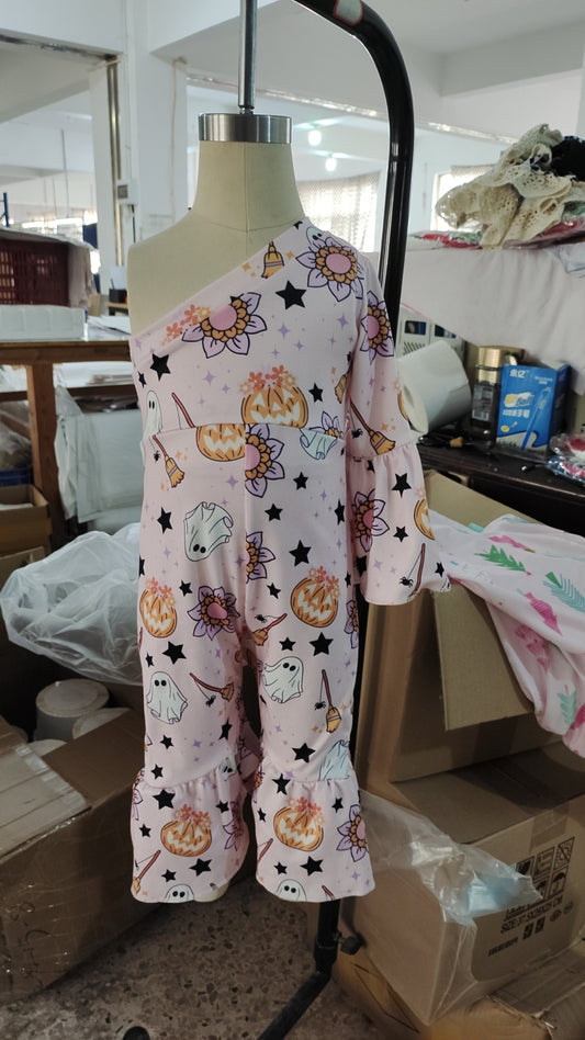 LR0287 Girls one shoulder Halloween punpkin pink bell bottom jumpsuit