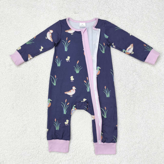LR1036 Duck Print Baby Girls Fall Sleeper Zipper Romper