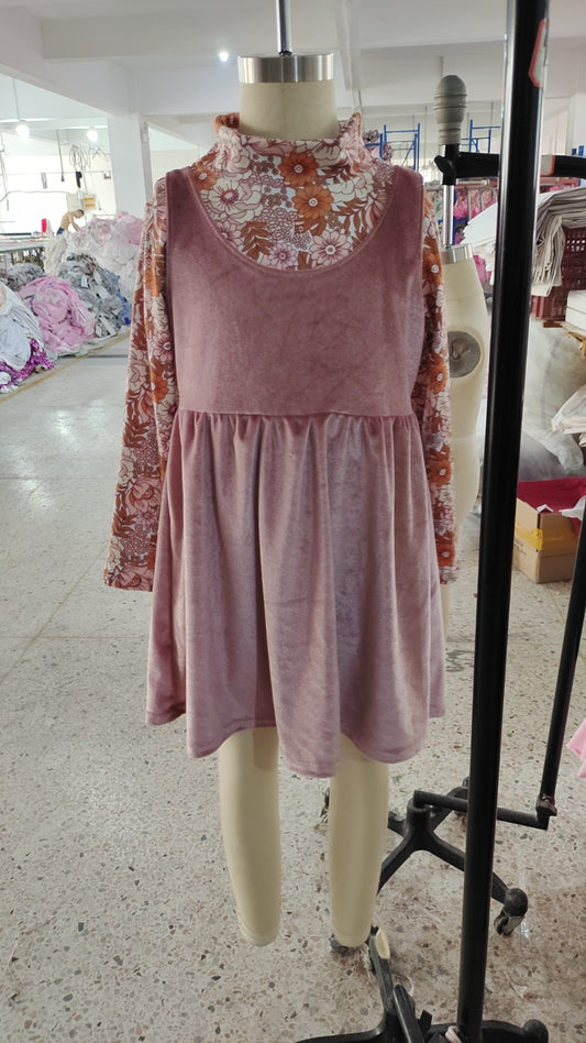 GLD0334 Flowers top brown velvet overall knee length skirts girls fall clothes set