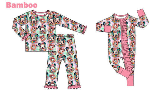 (Custom Design Preorder MOQ 20 Each Design) Cartoon Mouse Flowers Print Girls Pajamas Matching Bamboo Clothes Sisters Wear