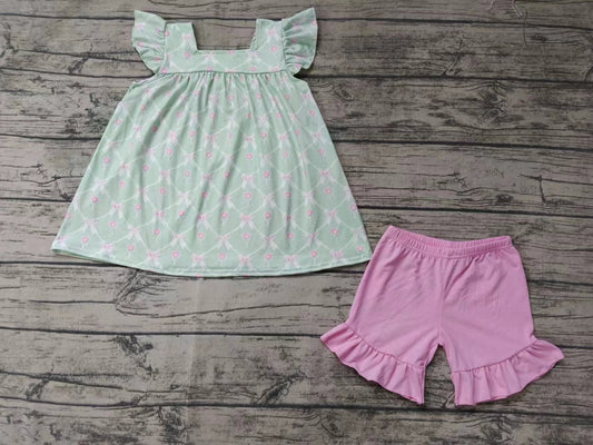 (Custom Design Preorder MOQ 5) Bows Flowers Tunic Top Pink Shorts Girls Summer Clothes Set