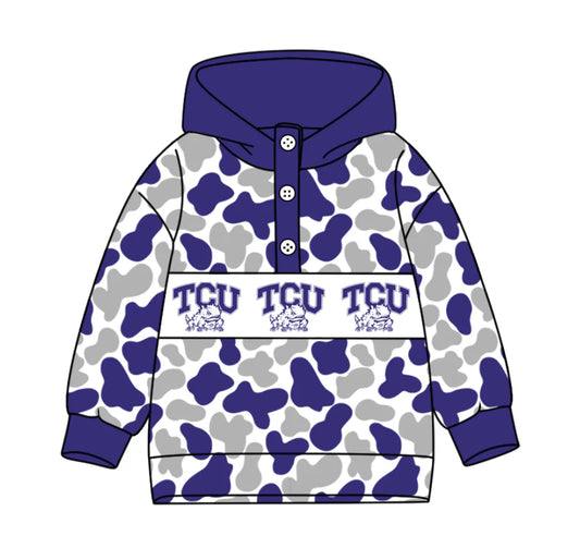 (Custom Design Preorder MOQ 5) Team's TCU Horned Frogs Camo Print Kids Long Sleeve Buttons Hoodie Top