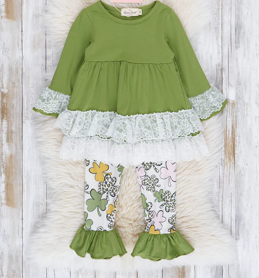 (Custom Design Preorder MOQ 5) Green Ruffles Tunic Top Quatrefoil Legging Pants Girls St. Patrick's Clothes Set