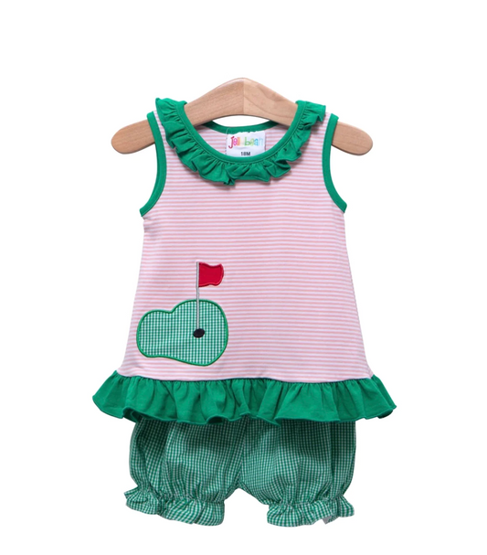(Custom Design Preorder MOQ 5) Golf Hole Print Top Green Plaid Shorts Girls Summer Clothes Set