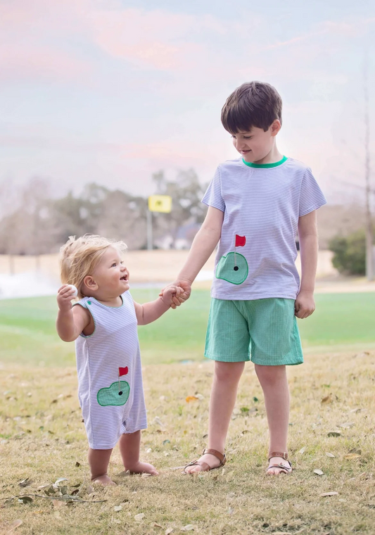 (Custom Design Preorder MOQ 5) Golf Hole Print Top Green Plaid Shorts Boys Summer Clothes Set