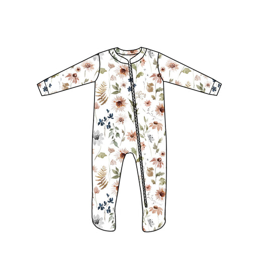 (Custom Design MOQ 5) White flowers baby girls zipper fall footed romper