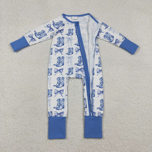 LR2420 Bows Boots Blue Print Baby Girls Western Zipper Sleeper Romper