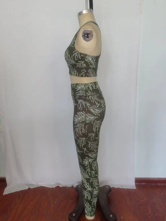(Pre-order)GSPO1463 Adult Green Leaf Print Woman Yoga Clothes Set