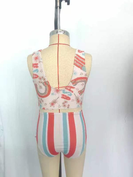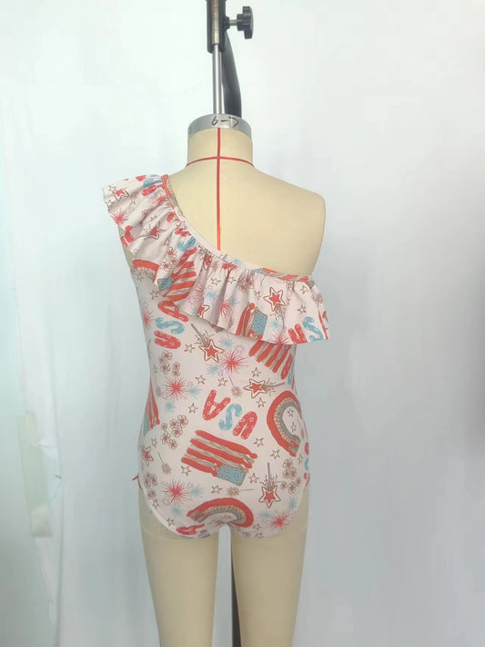 (Pre-order) S0226 Flowers USA Flag Print 1 Piece 4th of July Girls Swimsuits