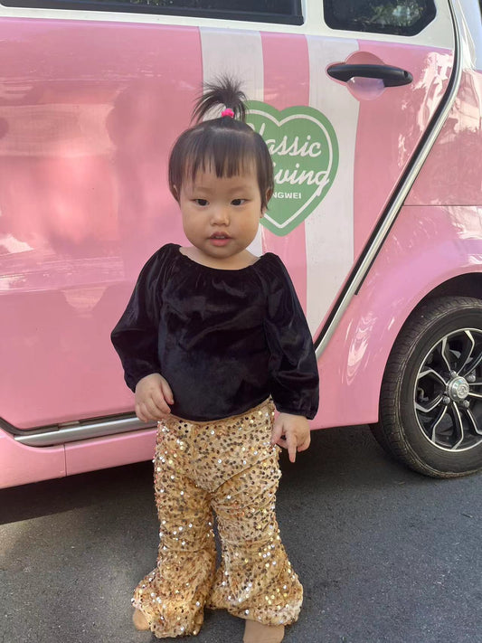 GLP0971 Black Velvet Top Gold Sequin Bell Pants Girls Clothes Sets