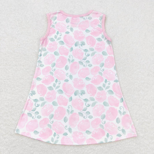 GSD1045 Pink Flowers Print Girls Knee Length Summer Dress