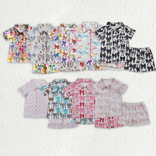 GSSO2487 Colorful Bows Print Girls Buttons Summer Pajamas Clothes Set