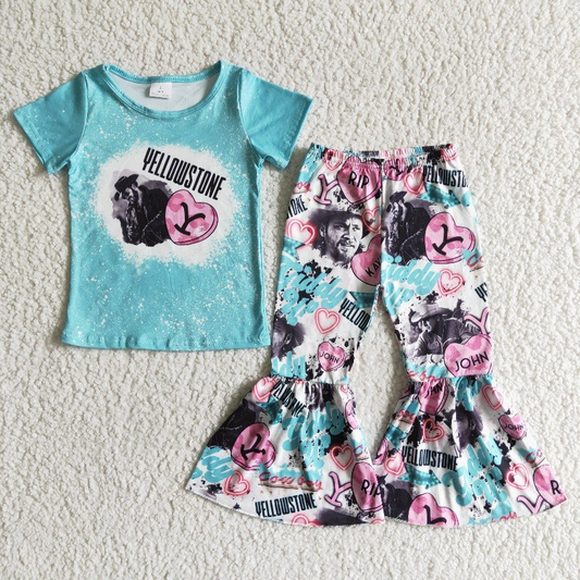Let's go girls print top pink bell bottom denim pants western outfits GSPO0496