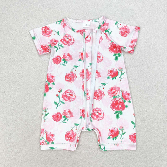 SR1768 Pink Flowers Print Baby Girls Summer Zipper Romper