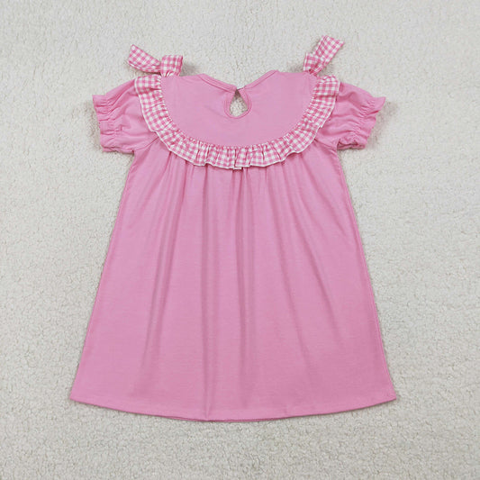 GSD3484 Daddy's Girl Embroidery Pink Bows Dog Plaid Print Girls Summer Knee Length Smocked Dress