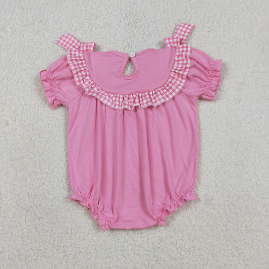 SR3250 Cross Embroidery Pink Plaid Baby Girls Easter Bubble Smocked Romper