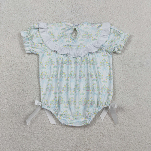 SR3843 Bows Embroidery Blue Flowers Print Baby Girls Summer Smocked Romper