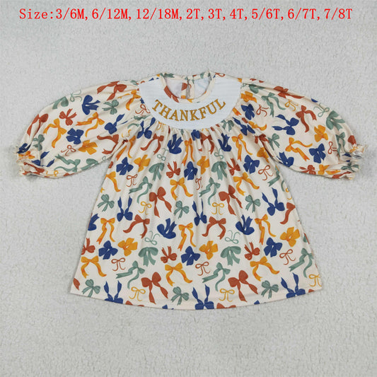 GLD1086 Thankful Embroidery Colorful Bows Girls Thanksgiving Smocked Knee Length Dress