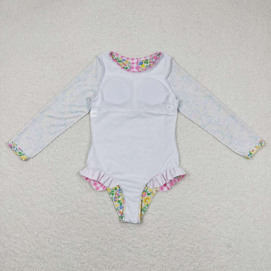 S0184 Girls Long Sleeve Flowers Print 1 Piece Zipper Swimsuits