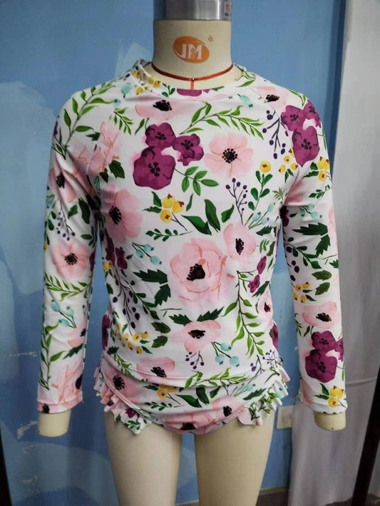S0180 Girls Flowers Print Long Sleeve 2 Pieces Swimsuits