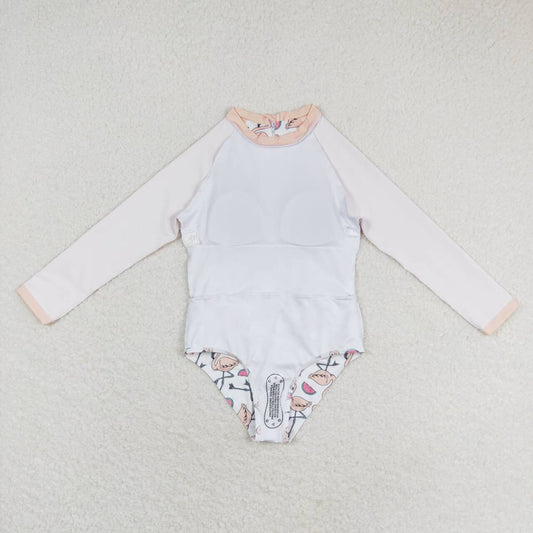 S0245 Flamingo Print Girls 1 Piece Long Sleeve Zipper Swimsuits