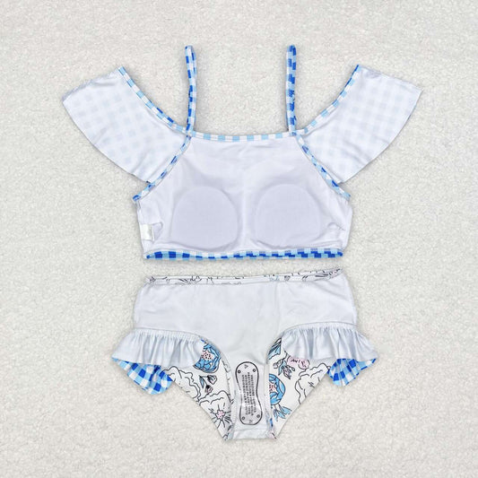 S0254 Blue Plaid Flowers Print Girls 2 Pieces Swimsuits