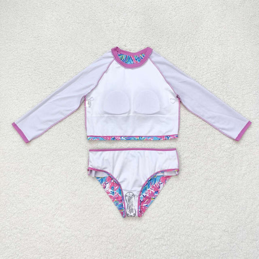 S0259 Purple Flowers Print Girls 2 Pieces Long Sleeve Swimsuits