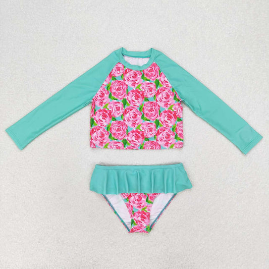 S0260 Green Flowers Print Girls 2 Pieces Long Sleeve Swimsuits