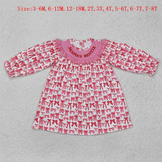 GLD0990 MAMA'S BESTIE Embroidery Pink Bows Print Smocked Girls Long Sleeve Knee Length Dress