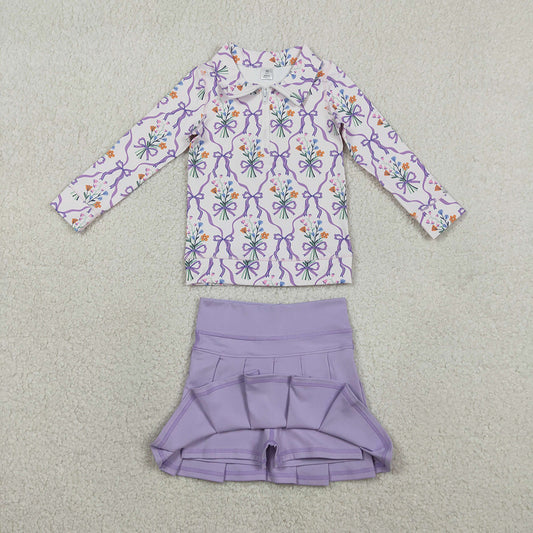 GLD1416 Flowers Bows Zipper Top Purple Skirts Shorts Girls Yoga Clothes Set