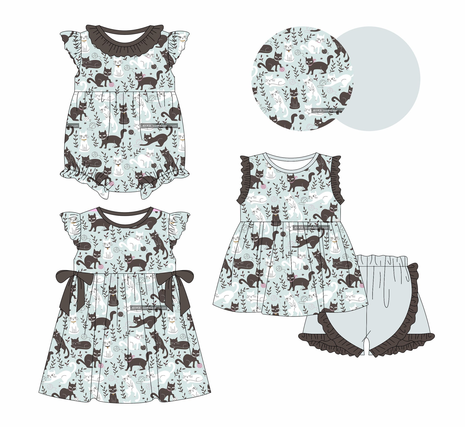 1.4(Custom Design Preorder MOQ 5 Each Design) Cats Print Girls Summer Matching Clothes Sisters Wear